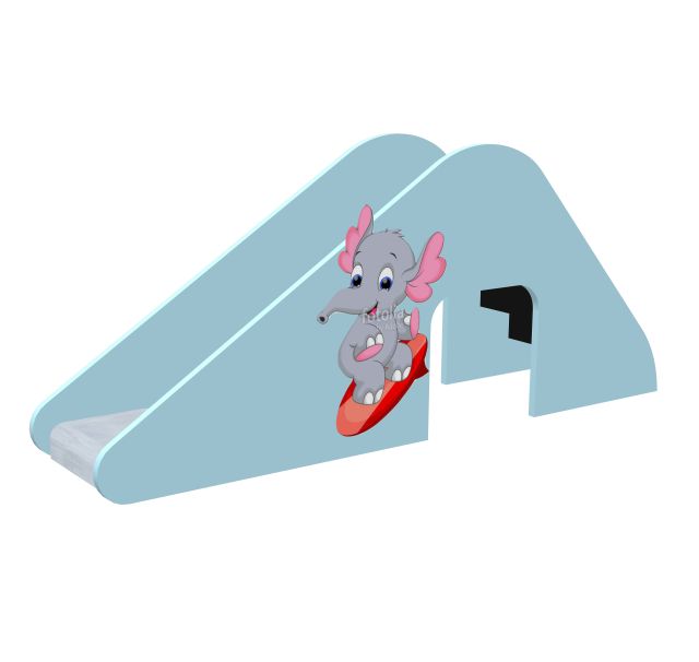 Peuterglijbaan olifant. Krasvaste en UV bestendige afbeelding op HPL platen. Platformhoogte 60 cm. RVS glijbaan